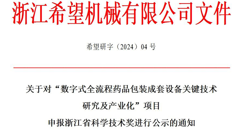 關(guān)于對“數(shù)字式全流程藥品包裝成套設(shè)備關(guān)鍵技術(shù)研究及產(chǎn)業(yè)化”項目 申報浙江省科學(xué)技術(shù)獎進行公示的通知